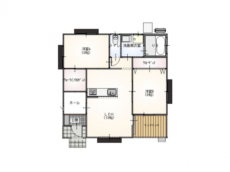 | 間取詳細 | 洋室6帖×2、LDK13帖(エアコン付)、洗面・脱衣、ユニットバス 、トイレ、ウッドデッキ3帖 |